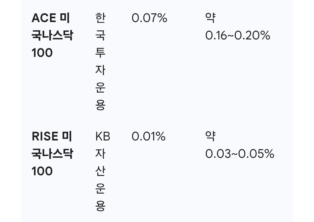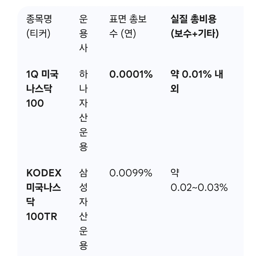 국내 상장된 나스닥100 ETF는 기초 지수(Nasdaq 100)가 같더라도 운영사마다 '총보수'와 실질적인 비용인 '기타비용'에서 차이가 납니다. 특히 연금저축처럼 장기 투자하는 계좌에서는 이 미세한 비용 차이가 최종 수익률을 결정지을 수 있어요.