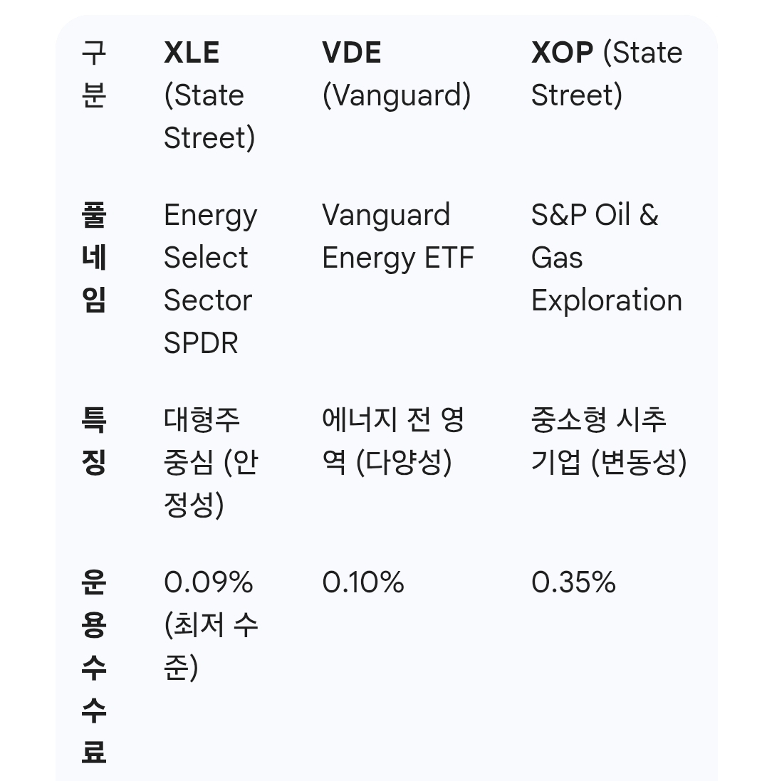 ⚠️ 면책공고: 본 포스팅은 투자 권유가 아니며, 모든 투자의 책임은 투자자 본인에게 있습니다.💰 미국 에너지 ETF 3대장 비교 분석: XLE, VDE, XOP 투자 가이드