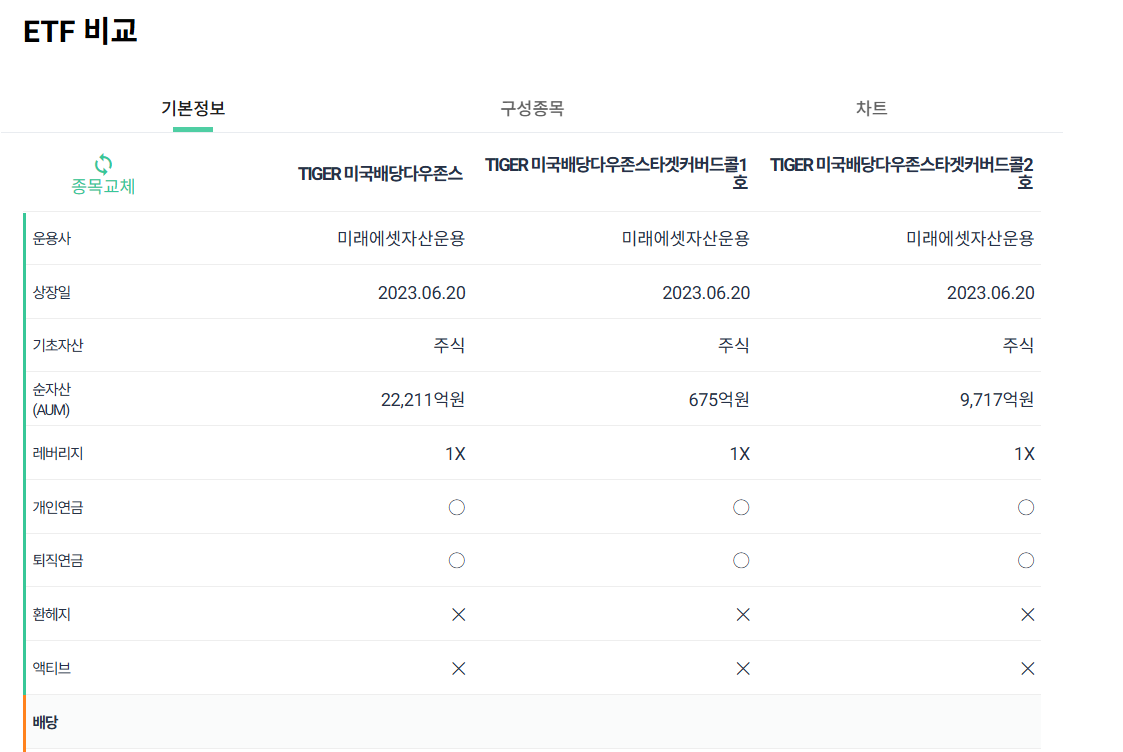 TIGER 미국배당다우존스 ETF 비교표 구분 TIGER 미국배당다우존스 타겟커버드콜 1호 타겟커버드콜 2호 운용사 미래에셋자산운용 미래에셋자산운용 미래에셋자산운용 상장일 2023.06.20 2023.06.20 2023.06.20 순자산 22,211억 원 675억 원 9,717억 원 전략 미국 배당주 직접 투자 배당주 + 커버드콜(3%) 배당주 + 커버드콜(7%) 배당/분배 분기배당 월분배 월분배 상승 여력 있음 일부 제한 대부분 제한 예상 인컴 2~3% 6~8% 10%+ 적합 투자자 장기투자자, 성장+배당 추구 월배당·안정적 인컴 선호 현금흐름 최우선, 고배당 선호